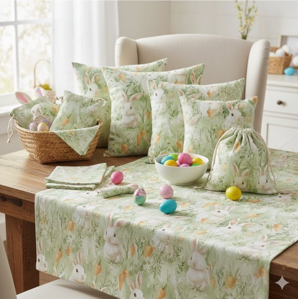 Mesa de Páscoa: Guardanapos de pano, cestinhos para pão e amêndoas, e individuais de mesa que elevam qualquer celebração em família.