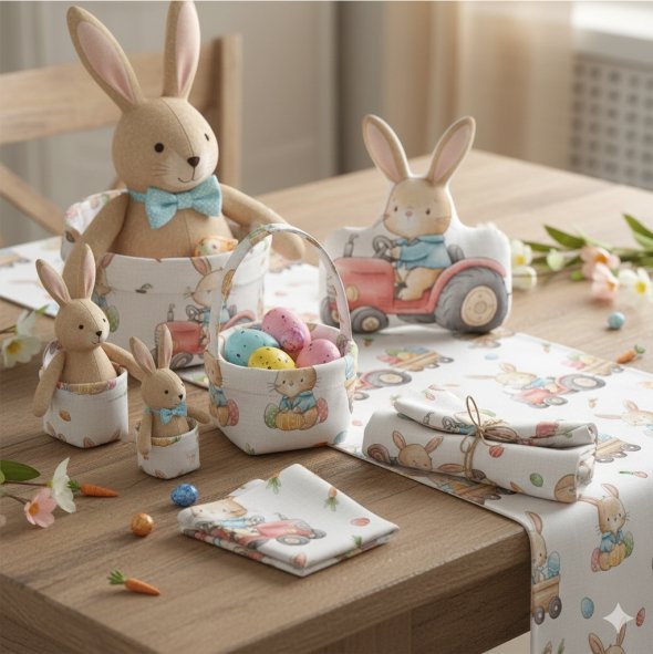 Mesa de Páscoa: Guardanapos de pano, cestinhos para pão e amêndoas, e individuais de mesa que elevam qualquer celebração em família.