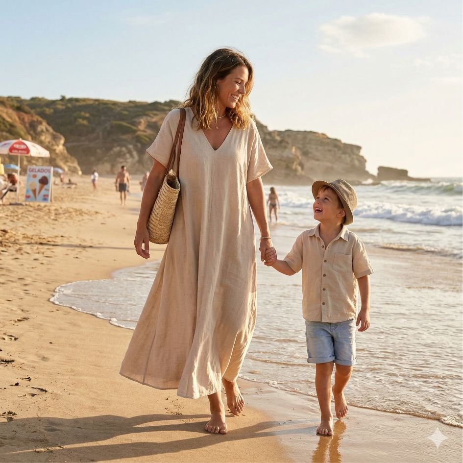Vestuário de Verão: Vestidos fluídos, saias midi e túnicas.